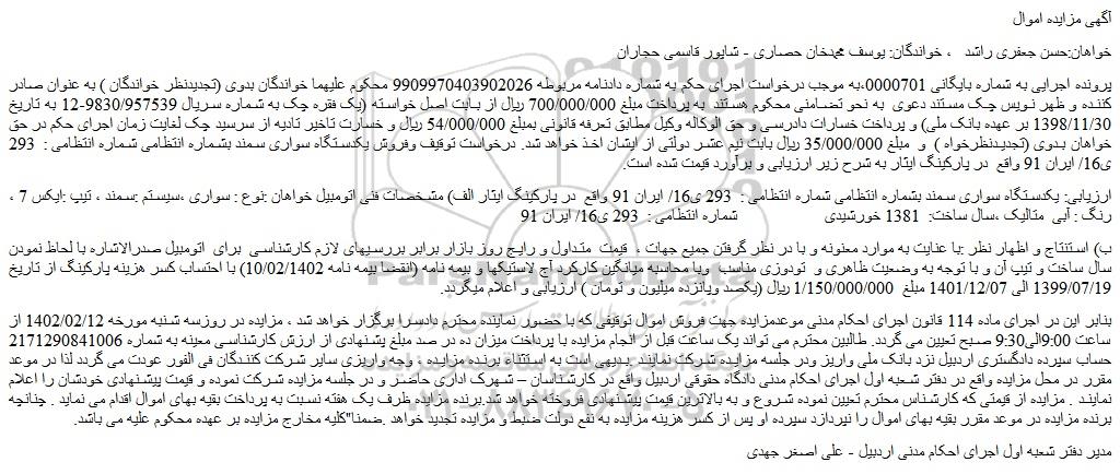 پرونده اجرایی به شماره بایگانی 0000701،به موجب درخواست اجرای حکم به شماره دادنامه مربوطه 9909970403902026 محکوم علیهما خواندگان بدوی (تجدیدنظر خواندگان ) به عنوان صادر کننده و ظهر نویس چک مستند دعوی به نحو تضامنی محکوم هستند به پرداخت مبلغ 700/000/000 ریال از بابت اصل خواسته (یک فقره چک به شماره سریال 9830/957539-12 به تاریخ 1398/11/30 بر عهده بانک ملی) و پرداخت خسارات دادرسی و حق الوکاله وکیل مطابق تعرفه قانونی بمبلغ 54/000/000 ریال و خسارت تاخیر تادیه از سرسید چک لغایت زمان اجرای حکم در حق خواهان بدوی (تجدیدنظرخواه ) و مبلغ 35/000/000 ریال بابت نیم عشر دولتی از ایشان اخذ خواهد شد. درخواست توقیف وفروش یکدستگاه سواری سمند بشماره انتظامی شماره انتظامی : 293 ی16/ ایران 91 واقع در پارکینگ ایثار به شرح زیر ارزیابی و برآورد قیمت شده است.