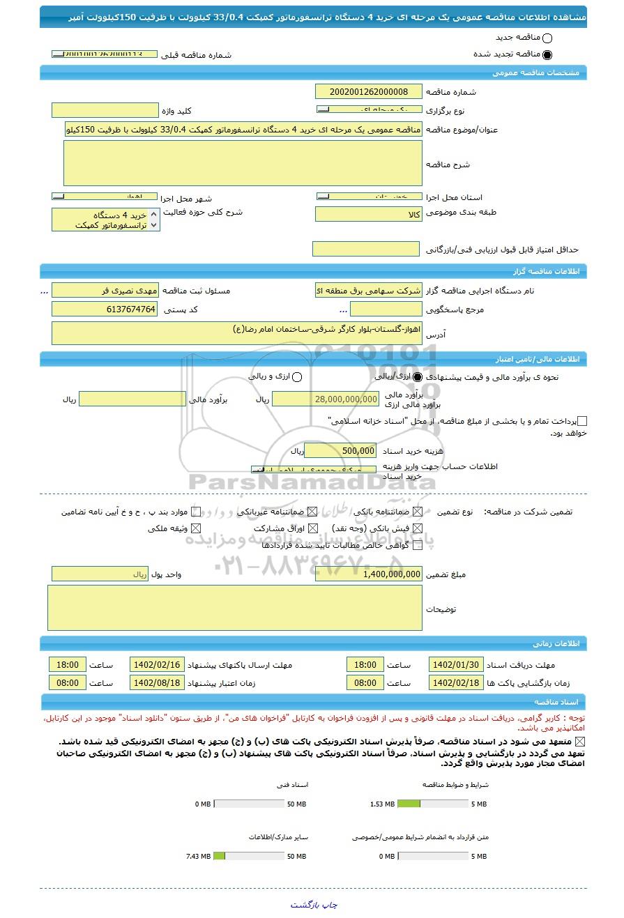 | مبلغ تضمین | 1,400,000,000 | واحد پول | ریال |