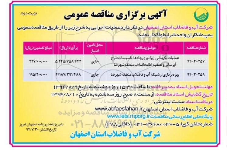 شرکت آب و فاضلاب استان اصفهان در نظر دارد عملیات اجرایی به شرح زیر را از طریق مناقصه عمومی به پیمانکاران واجد شرایط واگذار نماید
