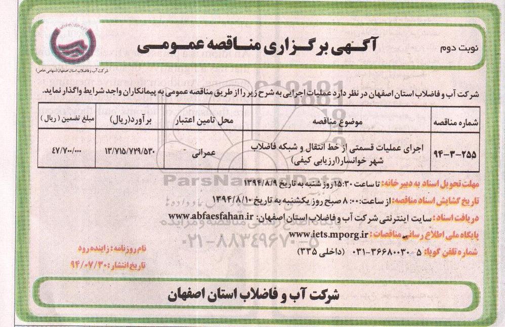 شرکت آب و فاضلاب استان اصفهان در نظر دارد عملیات اجرایی به شرح زیر را از طریق مناقصه عمومی به پیمانکاران واجد شرایط واگذار نماید