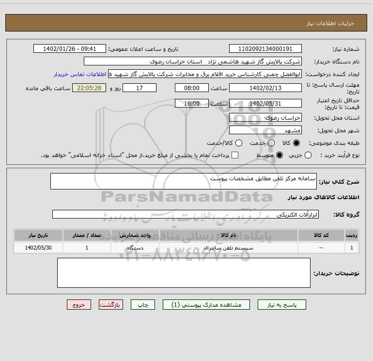 نام دستگاه خریدار:شرکت پالایش گاز شهید هاشمی نژاد استان خراسان رضوی