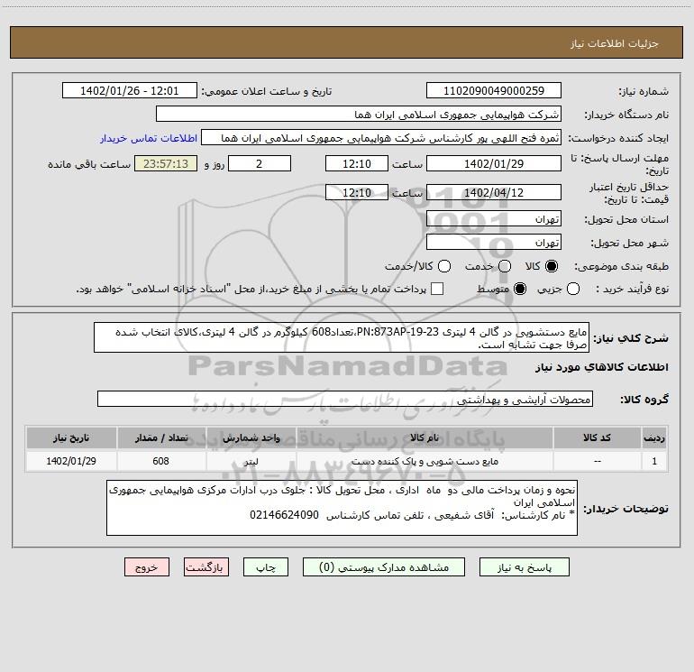 شرح کلی نیاز: مایع دستشویی در گالن 4 لیتری PN:873AP-19-23،تعداد608 کیلوگرم در گالن 4 لیتری،کالای انتخاب شده صرفا جهت تشابه است.