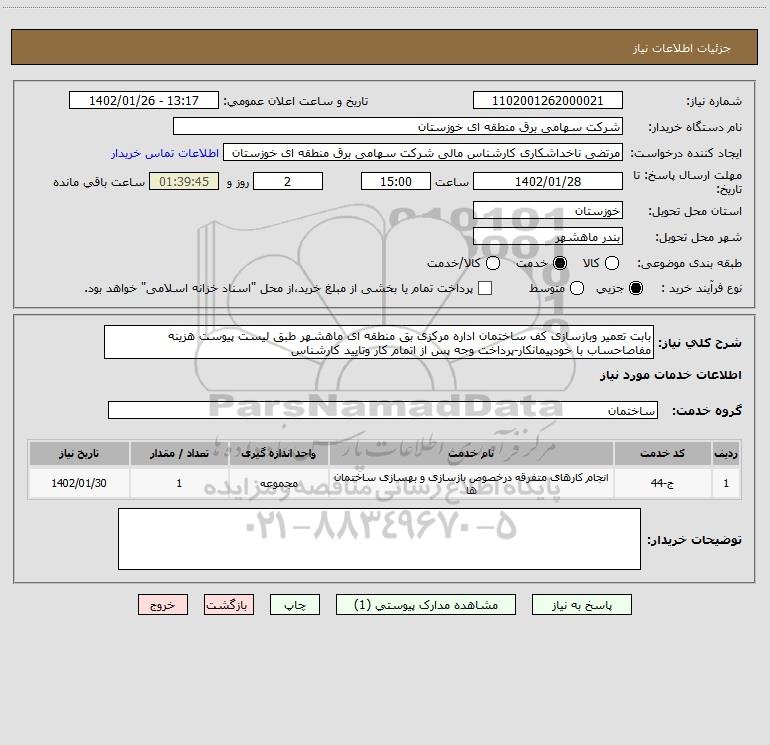 شرح کلی نیاز: بابت تعمیر وبازسازی کف ساختمان اداره مرکزی بق منطقه ای ماهشهر طبق لیست پیوست هزینه مفاصاحساب با خودپیمانکار-پرداخت وجه پس از اتمام کار وتایید کارشناس