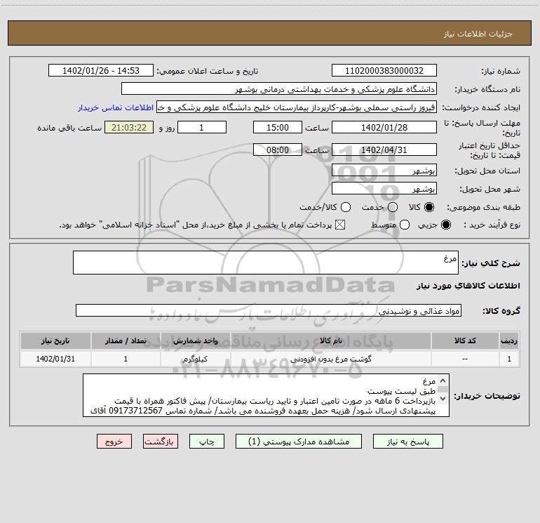 | 1 | -- | گوشت مرغ بدون افزودنی | کیلوگرم | 1 | 1402/01/31 |