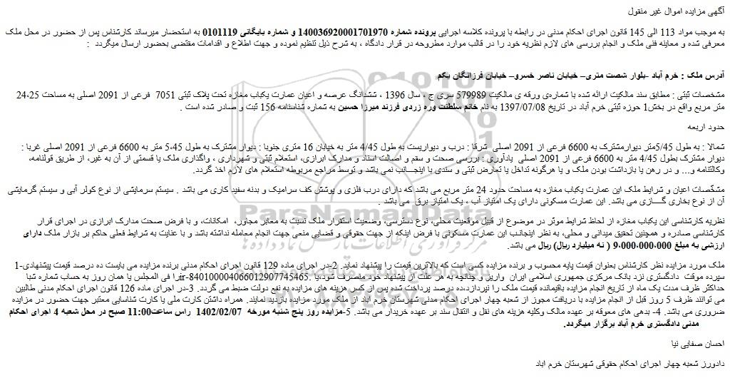 1-ملک مورد مزایده نظر کارشناس بعنوان قیمت پایه محسوب و برنده مزایده کسی است که بالاترین قیمت را پیشنهاد نماید. 2-در اجرای ماده 129 قانون اجرای احکام مدنی برنده مزایده می بایست ده درصد قیمت پیشنهادی را فی المجلس یا همان روز به حساب شماره شبا ir-840100004066012907745465. سپرده موقت دادگستری نزد بانک مرکزی جمهوری اسلامی ایران واریز و چنانچه به هر علت از پیشنهاد خود منصرف شود،یا حداکثر ظرف مدت یک ماه از تاریخ انجام مزایده باقیمانده قیمت ملک را نپردازد،ده درصد پرداخت شده پس از کسر هزینه های مزایده به نفع دولت ضبط می گردد. 3-در اجرای ماده 126 قانون اجرای احکام مدنی طالبین می توانند ظرف 5 روز قبل از انجام مزایده با دریافت مجوز از شعبه چهار اجرای احکام مدنی شهرستان خرم اباد از ملک مورد مزایده بازدید نمایند. همراه داشتن کارت ملی یا کارت شناسایی معتبر جهت حضور در مزایده ضروری می باشد. 4- بدهی های معوقه بر عهده مالک وکلیه هزینه های نقل و انتقال سند بر عهده خریدار می باشد. 5-مزایده روز پنج شنبه مورخه 1402/02/07 راس ساعت11:00 صبح در محل شعبه 4 اجرای احکام مدنی دادگستری خرم آباد برگزار میگردد.