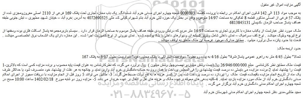 به موجب مواد 113 الی 142 قانون اجرای احکام در رابطه با پرونده کلاسه 0000393 شعبه چهارم اجرای مدنی خرم آباد ششدانگ یک باب مغازه تجاری تحت پلاک 169 فرعی از 2110 اصلی مفروزومجزی شده از پلاک 57 فرعی از اصلی مذکور قطعه 8 تفکیکی به مساحت 14/97 مترمربع واقع در بخش یک حوزه ثبتی خرم آباد بنام شهرام کیانی کد ملی 4072690325 به آدرس :خرم آباد – خیابان شهید مطهری – نبش جنوبی طبقه همکف پاساژ صاحب الزمان ،کدپستی 6813845131