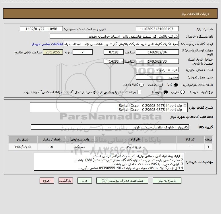 نام دستگاه خریدار:شرکت پالایش گاز شهید هاشمی نژاد استان خراسان رضوی