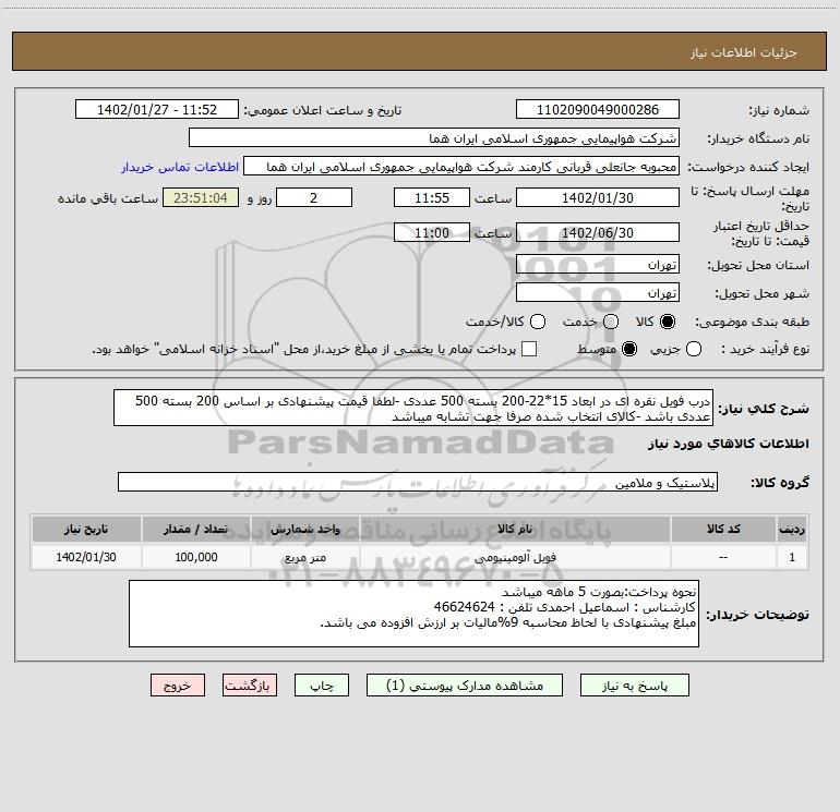 نام دستگاه خریدار:شرکت هواپیمایی جمهوری اسلامی ایران هما