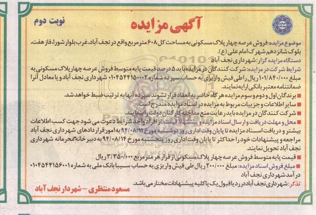 مزایده عمومی مزایده فروش عرصه چهارپلاک مسکونی نوبت دوم برگزار میگردد. از کلیه افراد متخصص و شرکتهای واجد شرایط دعوت به عمل میآید تا در این مزایده با کد خبرگزاری پارس نماد : 570919 شرکت نمایند تاریخ شروع مزایده : 1394/08/04 مهلت شرکت در مزایده: تا پایان روز 1394/08/11 مکان برگزاری اموال واگذاری استانهای اصفهان و دستهبندیهای مربوط به این حراجی املاک و زمین میباشد.