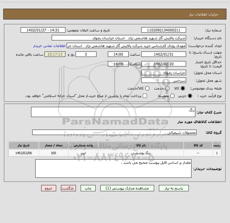 نام دستگاه خریدار:شرکت پالایش گاز شهید هاشمی نژاد استان خراسان رضوی