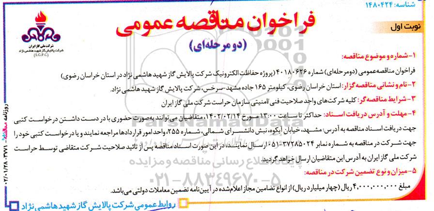 1.شماره و موضوع مناقصه : فراخوان مناقصه عمومی دو مرحله ای شماره 40180626 (پروژه حفاظت الکترونیک شرکت پالایش گاز شهید هاشمی نژاد در استان خراسان رضوی)
