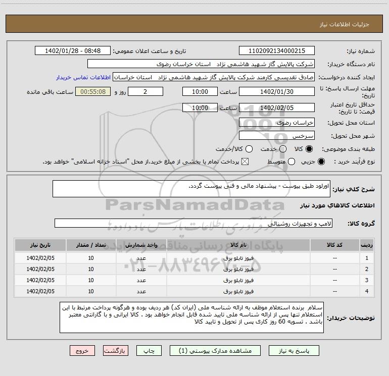 نام دستگاه خریدار:شرکت پالایش گاز شهید هاشمی نژاد استان خراسان رضوی