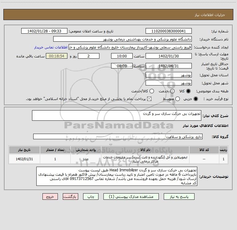 | 1 | -- | ایموبیلایزر و آتل (نگهدارنده و ثابت کننده) سر ملزومات خدمات مراکز درمانی سیار | عدد | 1 | 1402/01/31 |