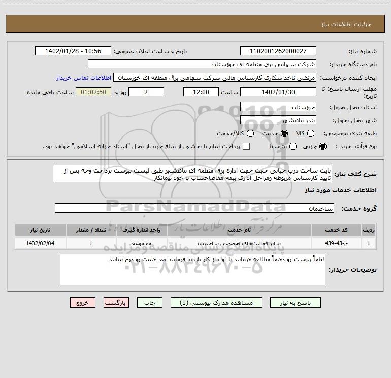 شرح کلی نیاز: بابت ساخت درب حیاتی جهت جهت اداره برق منطقه ای ماهشهر طبق لیست پیوست پرداخت وجه پس از تایید کارشناس مربوطه ومراحل اداری بیمه مفاصاحساب با خود پیمانکار