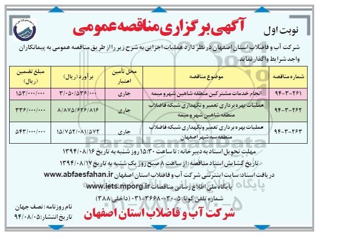 شرکت آب و فاضلاب استان اصفهان درنظردارد عملیات اجرایی به شرح زیر را از طریق مناقصه عمومی به پیمانکاران واجد شرایط واگذار نماید