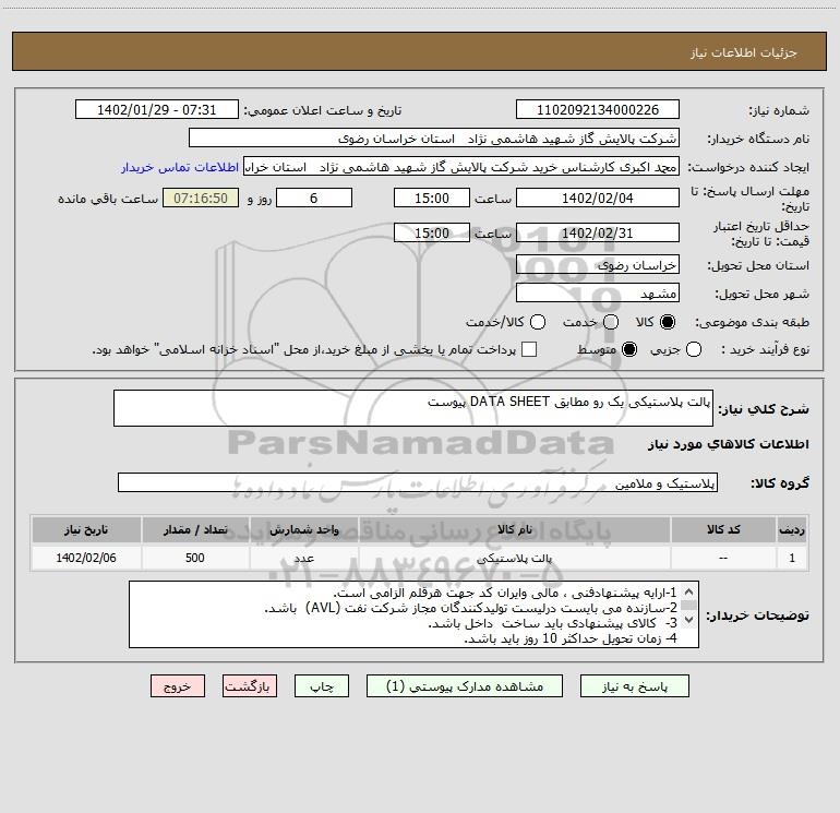 | 1 | -- | پالت پلاستیکی | عدد | 500 | 1402/02/06 |