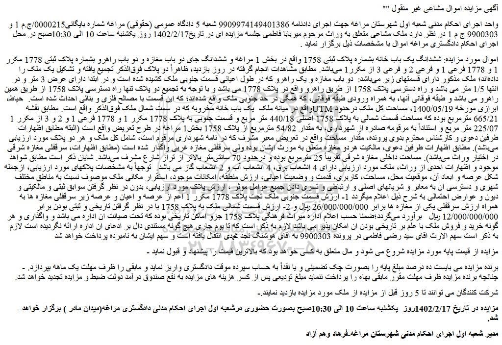 واحد اجرای احکام مدنی شعبه اول شهرستان مراغه جهت اجرای دادنامه 9909974149401386 شعبه 5 دادگاه عمومی (حقوقی) مراغه شماره بایگانی0000215/ج.م 1 و 9900303 ج م 1 در نظر دارد ملک مشاعی متعلق به وراث مرحوم میربابا فاطمی جلسه مزایده ای در تاریخ1402/2/17 روز یکشنبه ساعت 10 الی 10:30صبح در محل اجرای احکام دادگستری مراغه اموال با مشخصات ذیل برگزار نماید .