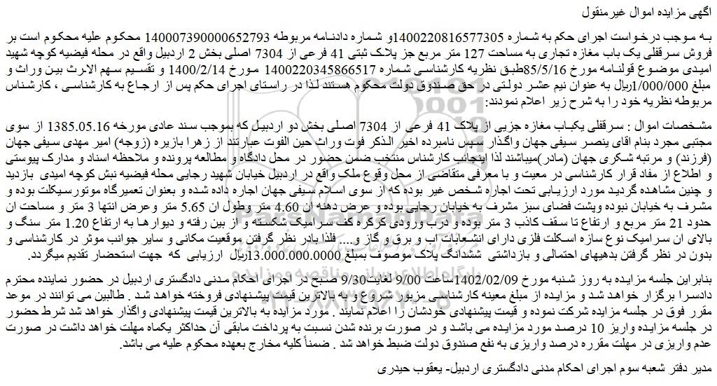 به موجب درخواست اجرای حکم به شماره 1400220816577305و شماره دادنامه مربوطه 140007390000652793 محکوم علیه محکوم است بر فروش سرقفلی یک باب مغازه تجاری به مساحت 127 متر مربع جز پلاک ثبتی 41 فرعی از 7304 اصلی بخش 2 اردبیل واقع در محله فیضیه کوچه شهید امیدی موضوع قولنامه مورخ 85/5/16طبق نظریه کارشناسی شماره 1400220345866517 مورخ 1400/2/14 و تقسیم سهم الارث بین وراث و مبلغ 1/000/000ریال به عنوان نیم عشر دولتی در حق صندوق دولت محکوم هستند لذا در راستای اجرای حکم پس از ارجاع به کارشناسی ، کارشناس مربوطه نظریه خود را به شرح زیر اعلام نمودند:
