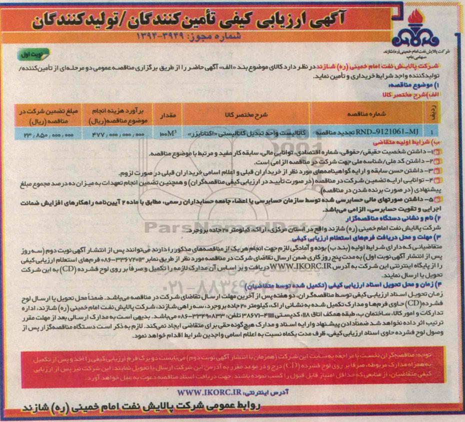 مناقصه کاتالیست واحد تبدیل کاتالیستی از کلیه افراد متخصص و شرکتها واجد شرایط دعوت به عمل میآید در مناقصه با کد خبرگزاری پارس نماد: 571830 شرکت نمایند.