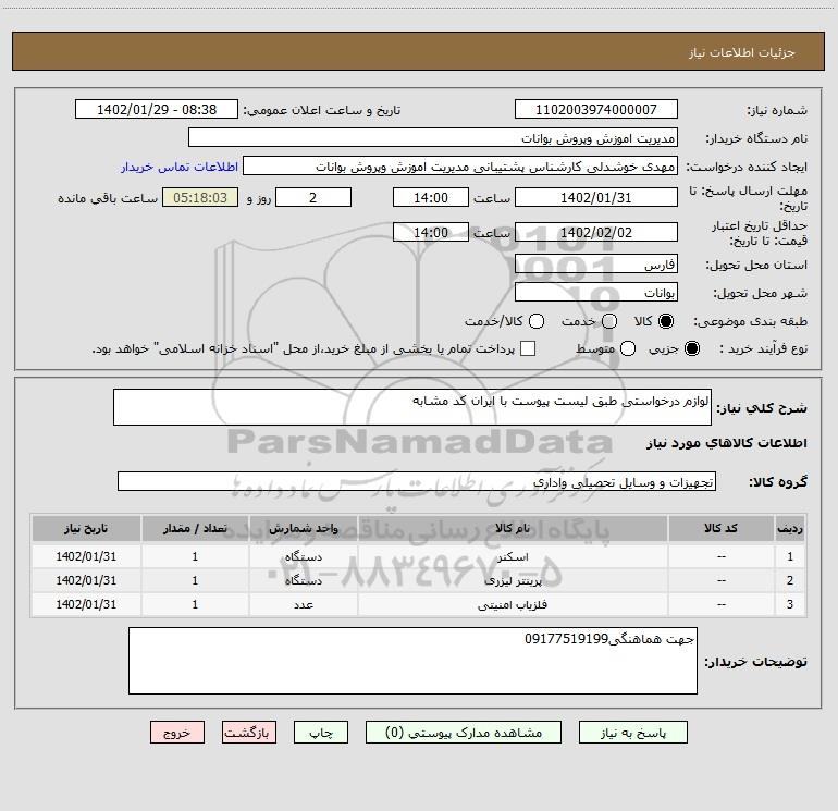 شرح کلی نیاز: لوازم درخواستی طبق لیست پیوست با ایران کد مشابه