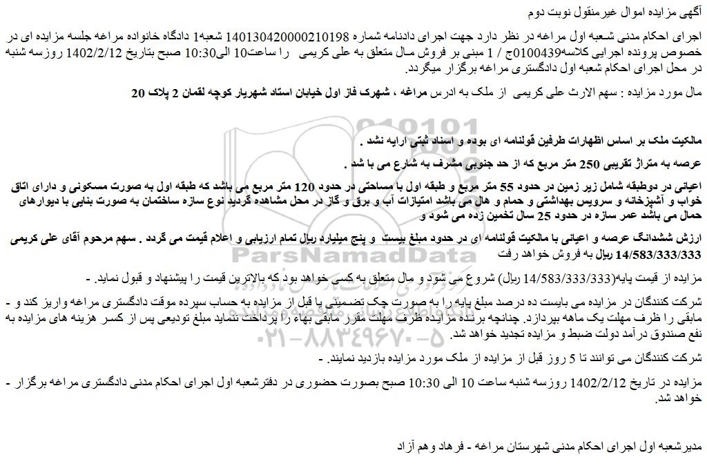 مال مورد مزایده : سهم الارث علی کریمی از ملک به ادرس مراغه ، شهرک فاز اول خیابان استاد شهریار کوچه لقمان 2 پلاک 20