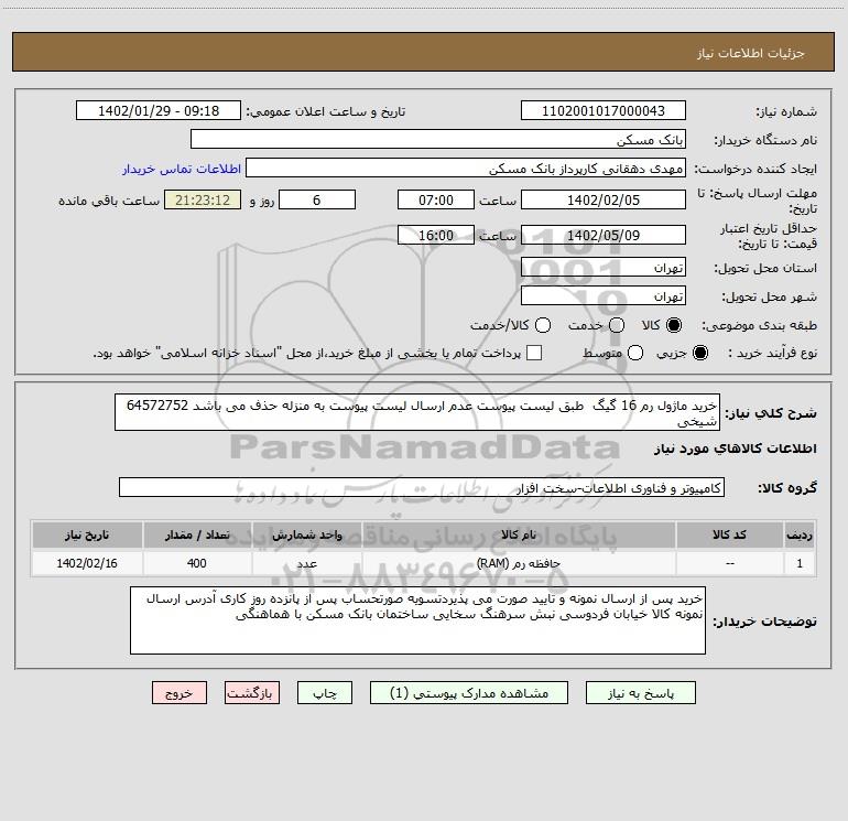 1 | -- | حافظه رم (RAM) | عدد | 400 | 1402/02/16 |