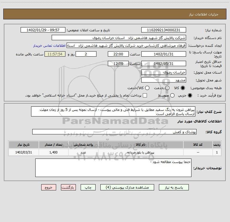 شرح کلی نیاز: پیراهن تترون به رنگ سفید مطابق با شرایط فنی و مالی پیوست - ارسال نمونه پس از 5 روز از زمان مهلت ارسال پاسخ الزامی است
