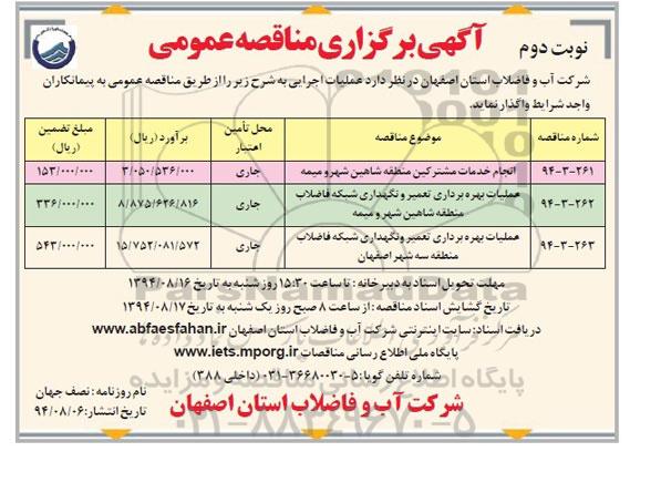 شرکت آب و فاضلاب استان اصفهان درنظردارد عملیات اجرایی به شرح زیر را از طریق مناقصه عمومی به پیمانکاران واجد شرایط واگذار نماید