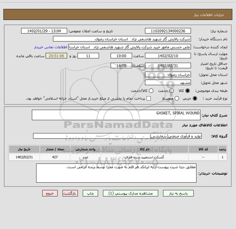 نام دستگاه خریدار:شرکت پالایش گاز شهید هاشمی نژاد استان خراسان رضوی