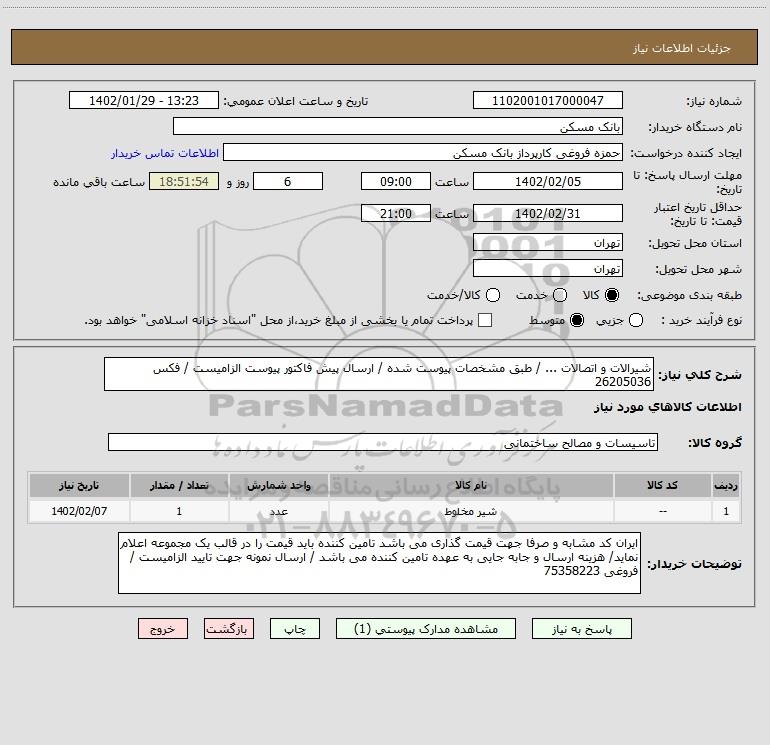 شرح کلی نیاز: شیرالات و اتصالات ... / طبق مشخصات پیوست شده / ارسال پیش فاکتور پیوست الزامیست / فکس 26205036