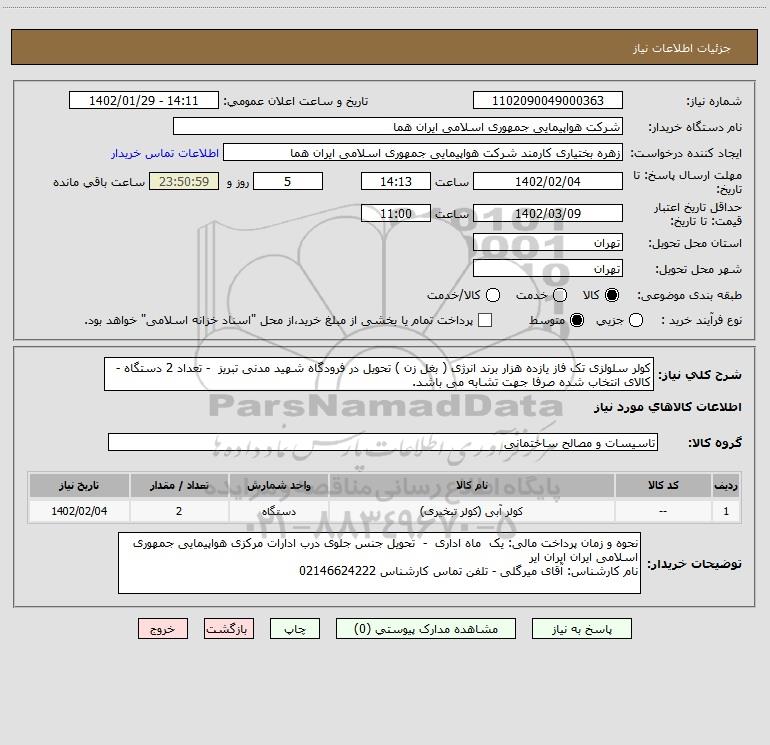 شرح کلی نیاز: کولر سلولزی تک فاز یازده هزار برند انرژی ( بغل زن ) تحویل در فرودگاه شهید مدنی تبریز - تعداد 2 دستگاه - کالای انتخاب شده صرفا جهت تشابه می باشد.
