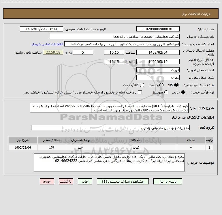 شرح کلی نیاز: فرم کتاب هواپیما ( MCC) شماره سریال طبق لیست پیوست است PN: 920-012-063 تعداد174 جلد هر جلد 50 ست هر ست 5 شیت ،کالای انتخابی صرفا جهت تشابه است.