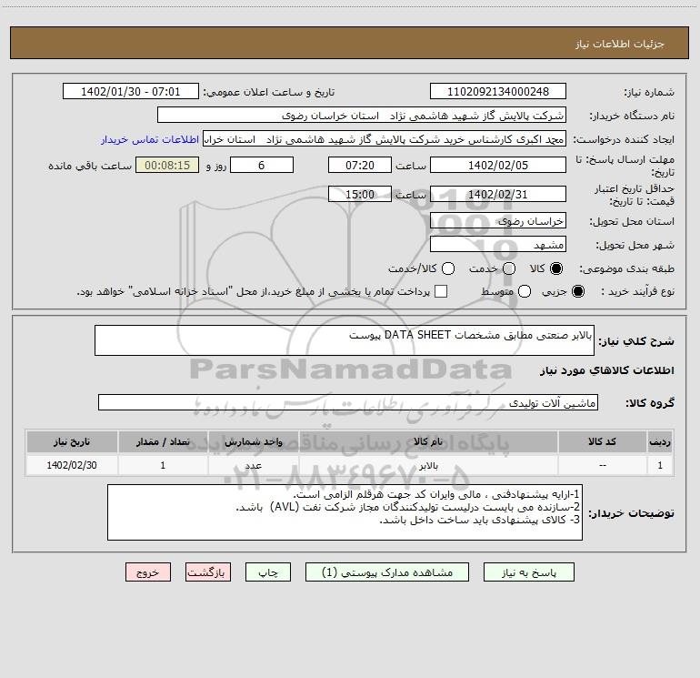 نام دستگاه خریدار:شرکت پالایش گاز شهید هاشمی نژاد استان خراسان رضوی