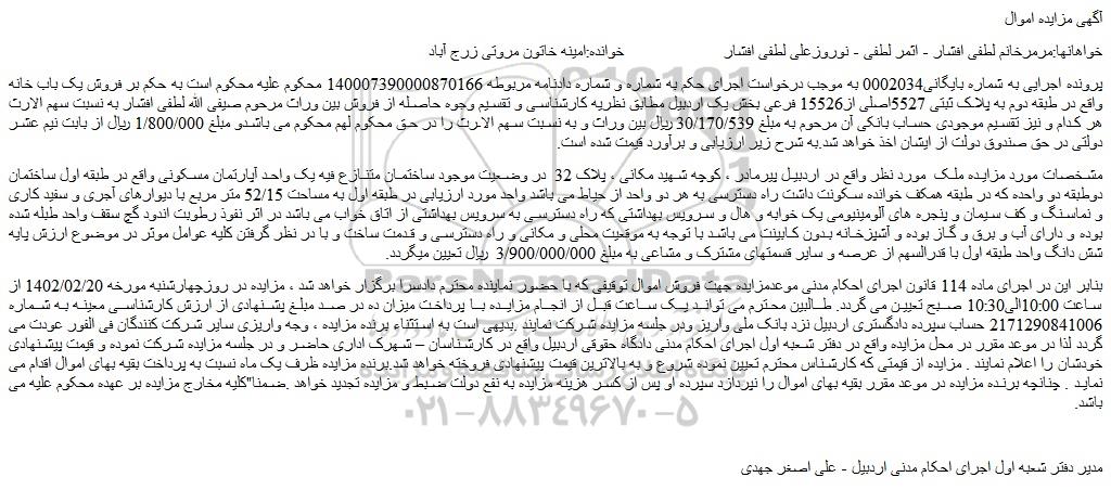 پرونده اجرایی به شماره بایگانی0002034 به موجب درخواست اجرای حکم به شماره و شماره دادنامه مربوطه 140007390000870166 محکوم علیه محکوم است به حکم بر فروش یک باب خانه واقع در طبقه دوم به پلاک ثبتی 5527اصلی از15526 فرعی بخش یک اردبیل مطابق نظریه کارشناسی و تقسیم وجوه حاصله از فروش بین وراث مرحوم صیفی الله لطفی افشار به نسبت سهم الارث هر کدام و نیز تقسیم موجودی حساب بانکی آن مرحوم به مبلغ 30/170/539 ریال بین وراث و به نسبت سهم الارث را در حق محکوم لهم محکوم می باشدو مبلغ 1/800/000 ریال از بابت نیم عشر دولتی در حق صندوق دولت از ایشان اخذ خواهد شد.به شرح زیر ارزیابی و برآورد قیمت شده است.