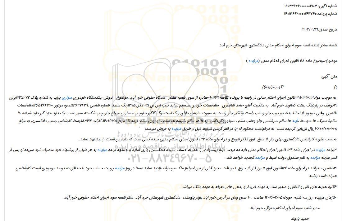 به موجب مواد113-137-138قانون اجرای احکام مدنی در رابطه با پرونده کلاسه 0101179صادره از سوی شعبه هفتم   دادگاه حقوقی خرم آباد  موضوع   فروش :یکدستگاه خودوری سواری پراید به شماره پلاک 277د63ایران 31توقیف در پارکینگ بعثت کمالوند خرم آباد  به مالکیت آقای حامد شانظری   مشخصات خودرو :سیستم :پراید تیپ اس ای 131 مدل:1395رنگ سفید  شماره شاسی :3627439شماره موتور :13/5766770مشخصات ظاهری  وفنی خودرو :از لحاظ بدنه دو درب جلو وعقب راست وگلگیر جلو راست به صورت سایشی دارای رنگ است،نوگ گلگیر جلوچپ خسارتی ،چراغ جلو چپ شکسته ،سپر عقب ترک دارد ،دزد گیر دارد شیشه ها  سالم،لاستیک ها متوسط ،آینه ها سالم ،سرشاسی جلو وعقب سالم ، ،موتور وگیربکس  به ظاهر سالم ،شیشه ها سالم ، تودوزی سالم  بیمه تا تاریخ 1401/11/01،کارکرد 83192توسط کارشناس رسمی دادگستری به مبلغ :1/800/000/000ریال ارزیابی گردیده است  به درخواست محکوم له :با در نظر گرفتن شرایط ذیل از طریق مزایده به فروش میرسد: