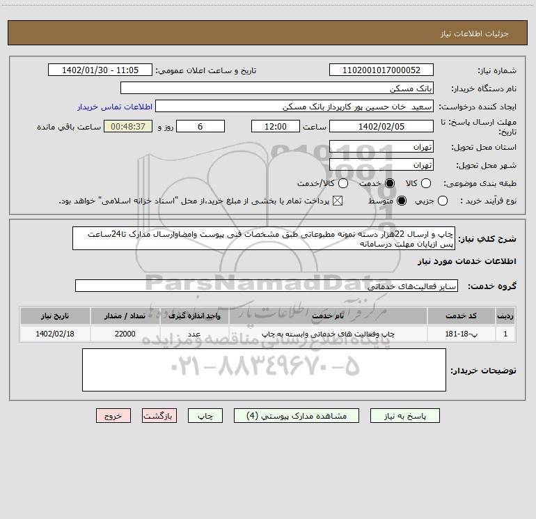 شرح کلی نیاز: چاپ و ارسال 22هزار دسته نمونه مطبوعاتی طبق مشخصات فنی پیوست وامضاوارسال مدارک تا24ساعت پس ازپایان مهلت درسامانه