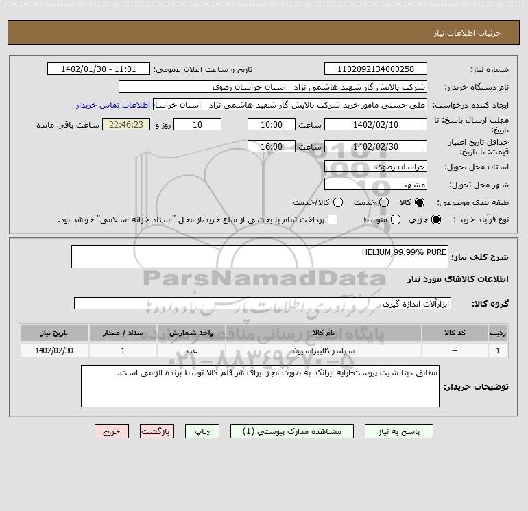 شرح کلی نیاز: HELIUM,99.99% PURE