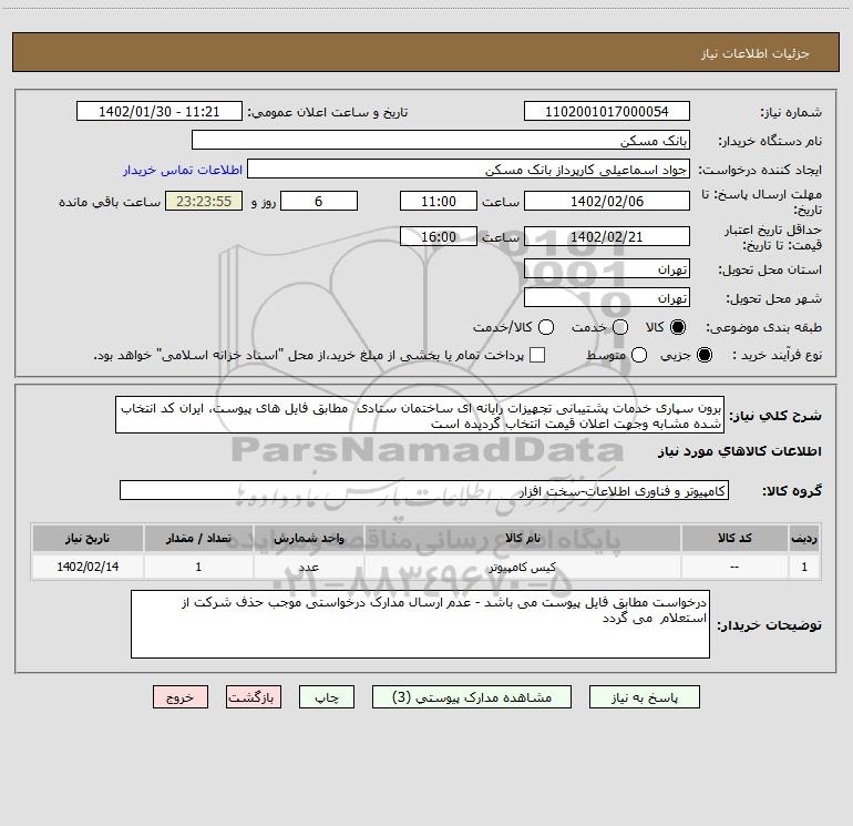 شرح کلی نیاز: برون سپاری خدمات پشتیبانی تجهیزات رایانه ای ساختمان ستادی مطابق فایل های پیوست، ایران کد انتخاب شده مشابه وجهت اعلان قیمت انتخاب گردیده است