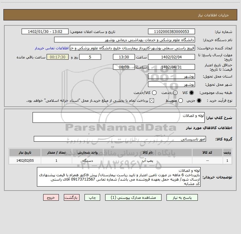 توضیحات خریدار:لوله و اتصالات بازپرداخت 6 ماهه در صورت تامین اعتبار و تایید ریاست بیمارستان/ پیش فاکتور همراه با قیمت پیشنهادی ارسال شود/ هزینه حمل بعهده فروشنده می باشد/ شماره تماس 09173712567 آقای راستی کد مشابه