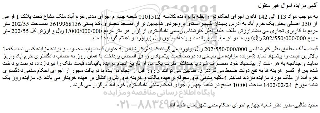 به موجب مواد 113 الی 142 قانون اجرای احکام در رابطه با پرونده کلاسه 0101512 شعبه چهارم اجرای مدنی خرم آباد ملک مشاع تحت پلاک 1 فرعی از 350 اصلی بخش یک خرم آباد به آدرس :میدان گپ-راستای بروجردی ها-پایین تر از مسجد معماری-کد پستی 3619968136 بمساحت 202/55 متر مربع با کاربری تجاری می باشد.ارزش ملک طبق نظر کارشناس رسمی دادگستری از قرار هر متر مربع 1/000/000/000 ریال و ارزش کل 202/55 متر مربع 202/550/000/000 ریال(دویست و دو میلیارد و پانصد و پنجاه میلیون ریال )برآورد و اعلام گردیده است.