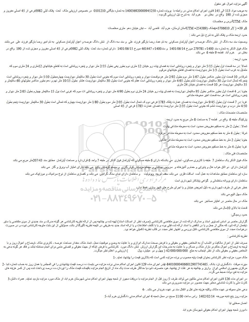 5-مزایده روز پنج شنبه مورخه 1402/02/14 راس ساعت 11:00 صبح در محل شعبه 4 اجرای احکام مدنی دادگستری خرم آباد