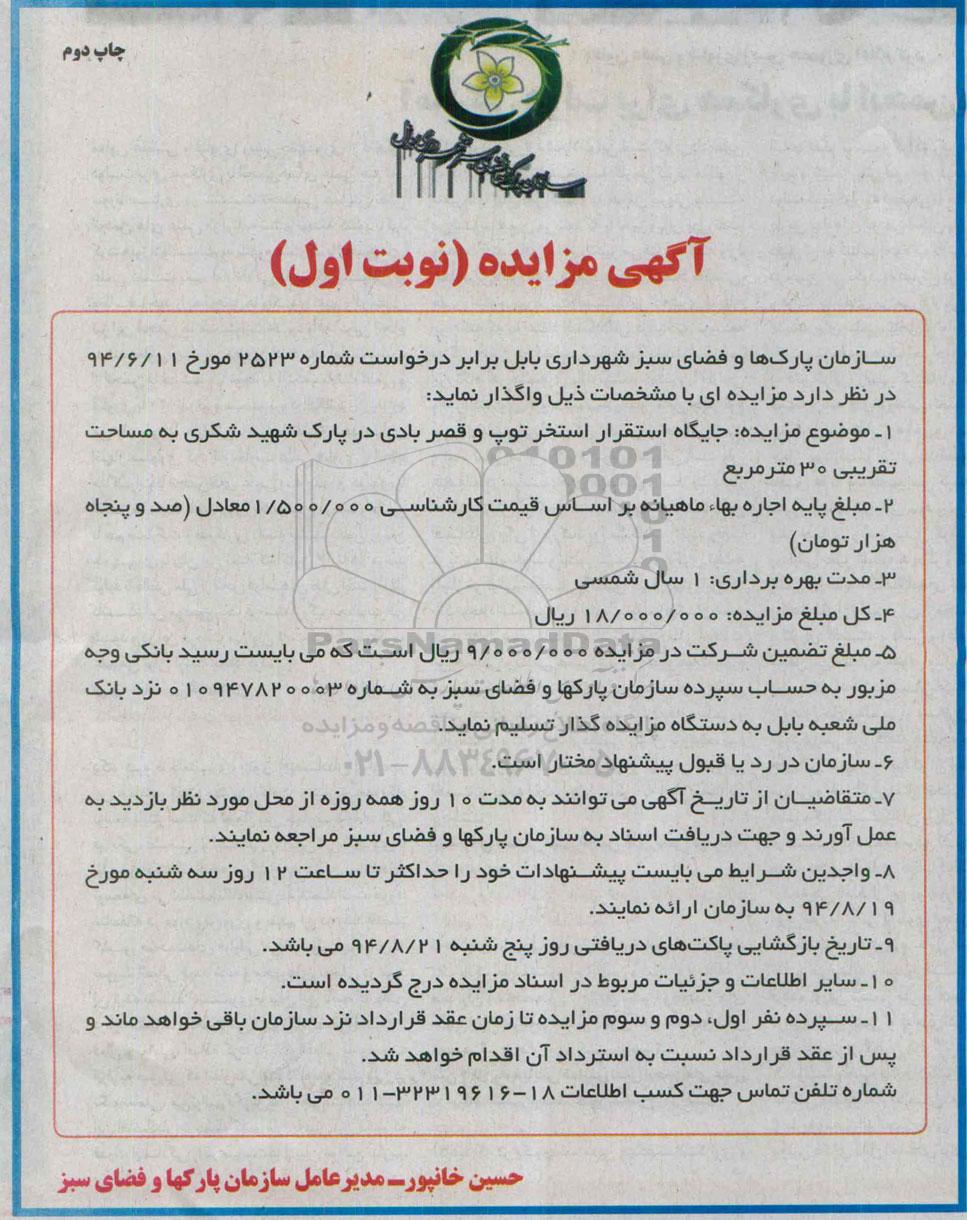 سازمان پارکها و فضای سبز شهرداری بابل برابر درخواست شماره 2523 مورخ 94.6.11 در نظر دارد مزایده ای با مشخصات ذیل واگذار نماید