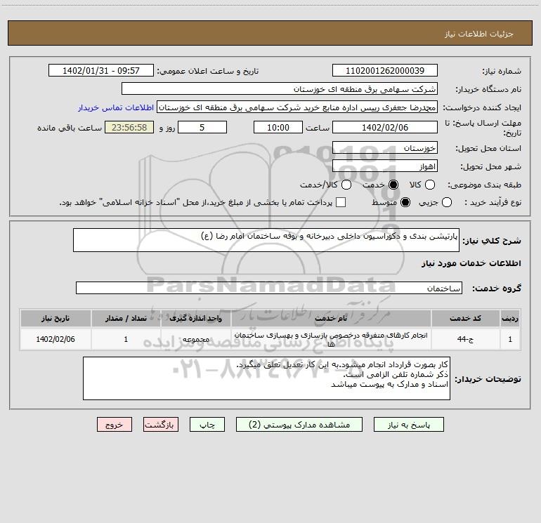 شرح کلی نیاز: پارتیشن بندی و دکوراسیون داخلی دبیرخانه و بوفه ساختمان امام رضا (ع)