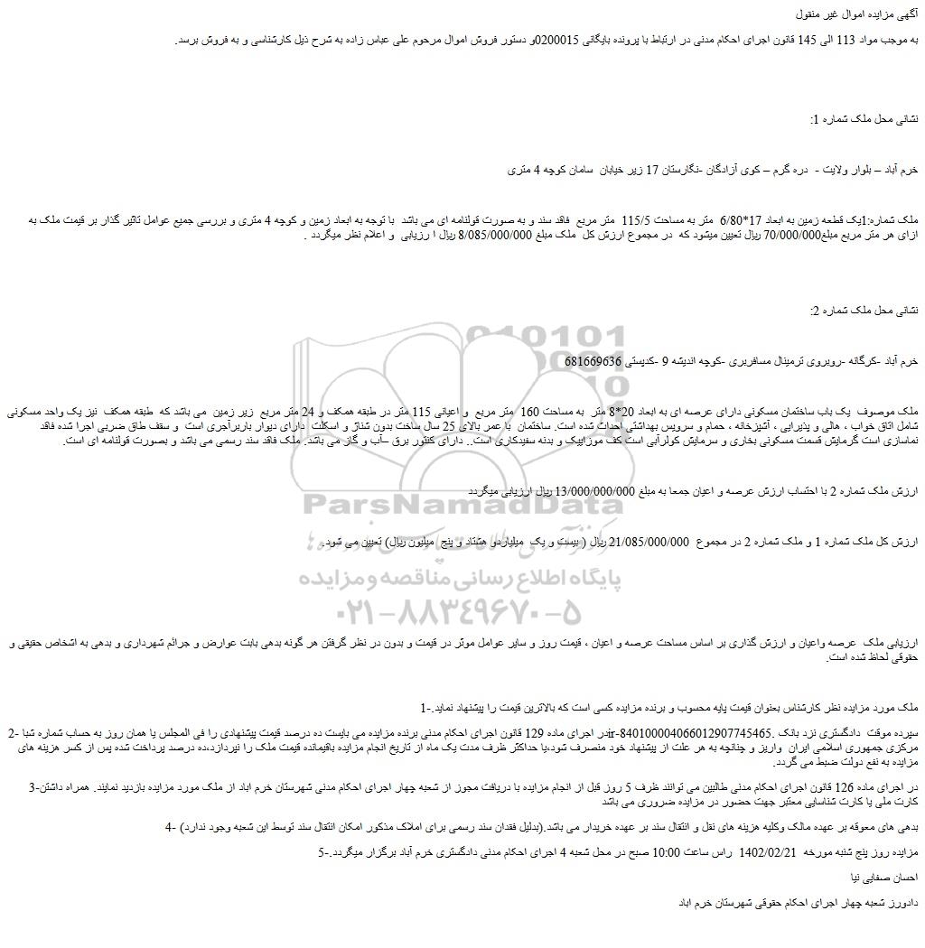 5-مزایده روز پنج شنبه مورخه 1402/02/21 راس ساعت 10:00 صبح در محل شعبه 4 اجرای احکام مدنی دادگستری خرم آباد برگزار میگردد