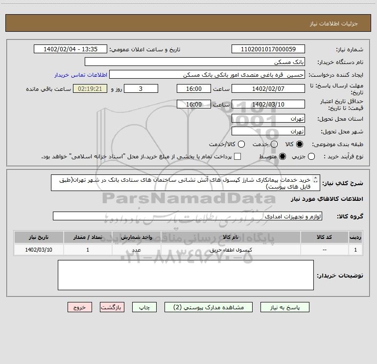شرح کلی نیاز: خرید خدمات پیمانکاری شارژ کپسول های آتش نشانی ساختمان های ستادی بانک در شهر تهران(طبق فایل های پیوست)