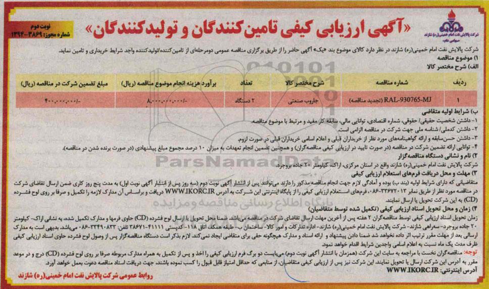 2 RAL-930765-MJ (تجدید مناقصه ) جاروب صنعتی 8.000.000.000 2دستگاه 400.000.000