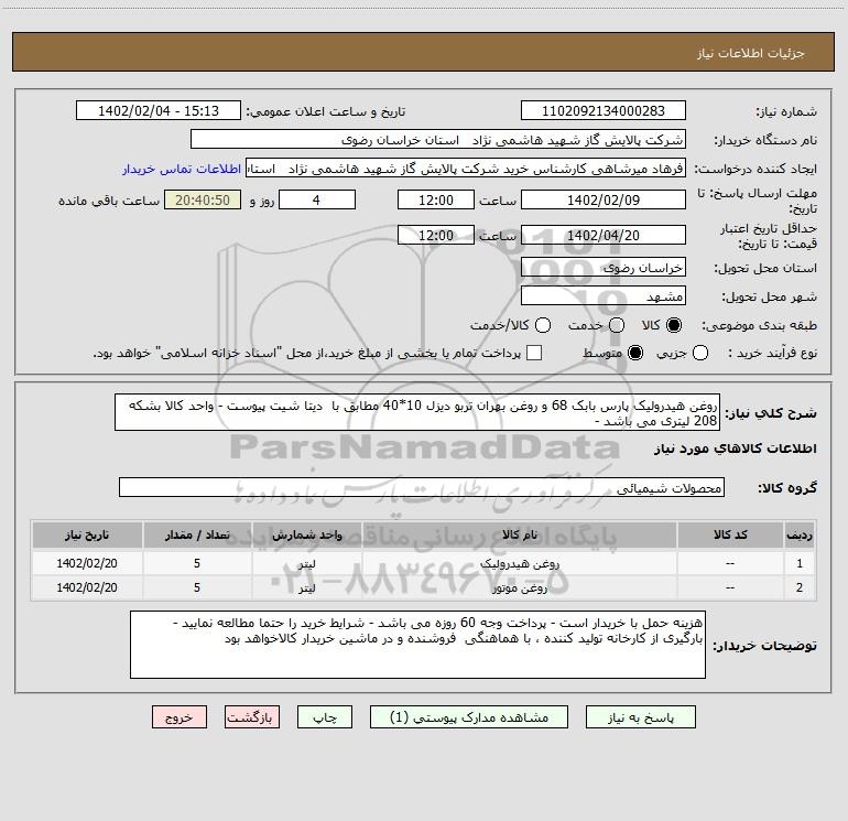 شرح کلی نیاز: روغن هیدرولیک پارس بابک 68 و روغن بهران تربو دیزل 10*40 مطابق با دیتا شیت پیوست - واحد کالا بشکه 208 لیتری می باشد -