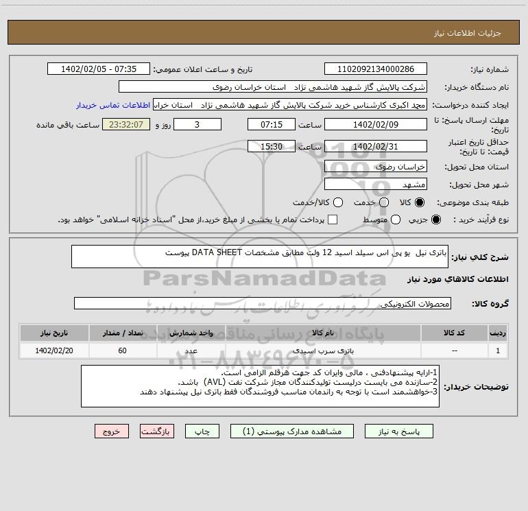 نام دستگاه خریدار:شرکت پالایش گاز شهید هاشمی نژاد استان خراسان رضوی