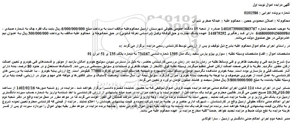 مشخصات اموال : الف) مشخصات وسیله نقلیه : سواری پپژو پارس سفید رنگ مدل 1395 شماره شاسی 734167 به شماره پلاک 135 ی 51 ایران 91