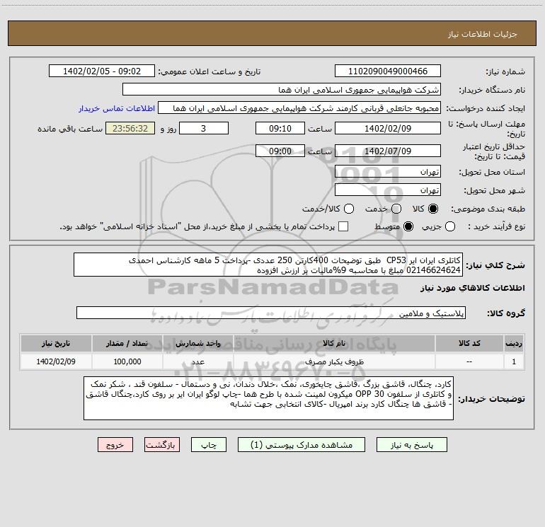 شرح کلی نیاز: کاتلری ایران ایر CP53 طبق توضیحات 400کارتن 250 عددی -پرداخت 5 ماهه کارشناس احمدی 02146624624 مبلغ با محاسبه 9%مالیات بر ارزش افزوده